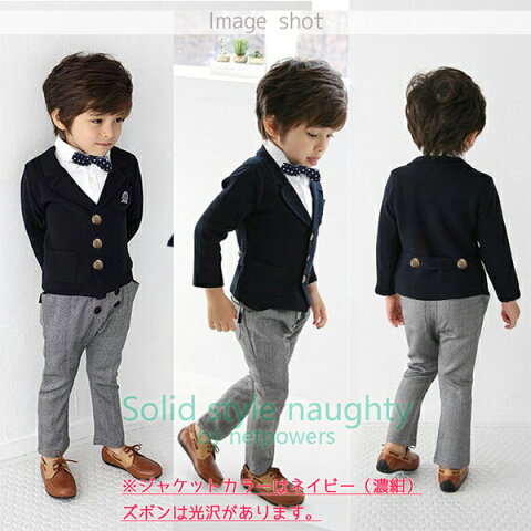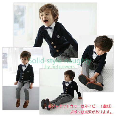 ) セット内容 【ジャケット + パンツ + 蝶ネクタイ】計3点セット 「ジャケット」 カラー:濃紺 素材:綿100% 「パンツ」 カラー:グレー(ヘリンボーン織) 「蝶ネクタイ」 カラー:紺 x 白(水玉柄) ゴム紐式:ゴム伸縮により最大頭囲60cmまで対応可 ※ワイシャツ部分は襟元部分のみで縫われています。
